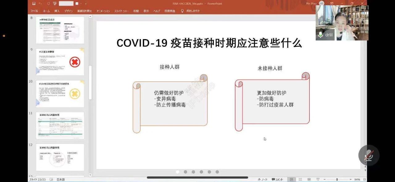 当前全球新冠肺炎疫情仍在持续,变异病毒株已在很多国家和地区传播,造成多国严重疫情,无数家庭都深受其害。虽然目前国内以及日本的疫情得到了控制,但是这场战役还远远没有结束,对于新冠病毒的认知和研究依然有着十分深远的意义,目前来说接种疫苗是预防控制疫情最有效的一种手段。本次论坛的主题为“COVID-19疫苗解读”,旨在从科学专业的角度带大家深入了解当前的各类新型冠状病毒疫苗,尤其是当前日本普遍接种的“mRNA疫苗”,从而解除公众对于新冠疫苗存在的诸多疑虑。