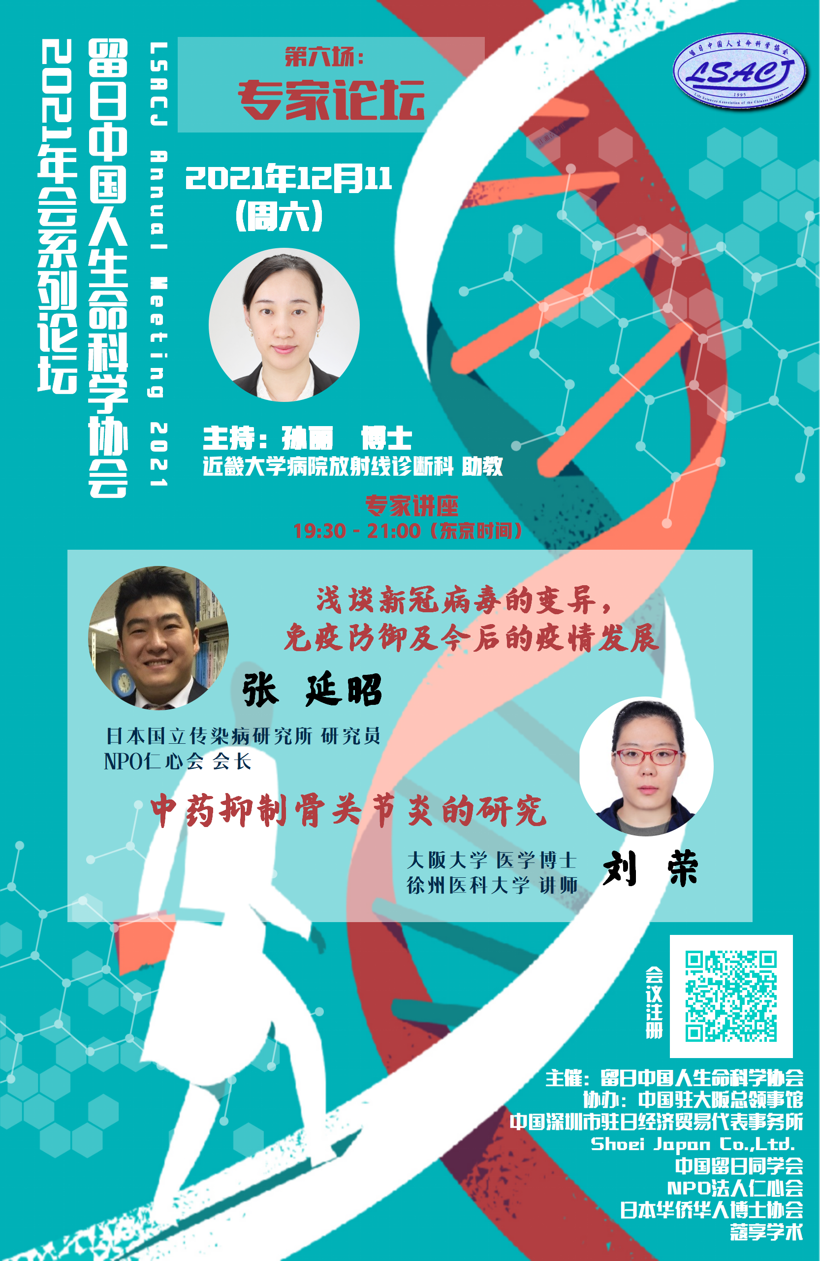 7月中旬,留日中国人生命科学协会在线上成功举办了2021年会系列第一场论坛,主题为“COVID-19疫苗解读”。2021年会系列第二场论坛—“新星登场”于八月末成功举办,主题为“黄独素B代谢产物 - 蛋白共价结合-肝脏毒性”以及“从中草药三七谈起,植物生病的时候,它会干些什么?”。九月、十月,2021年会系列第三场、第四场 “专家论坛”也成功举办,主题分别为“量子化学开拓构造生命科学和COVID-19的未来之路”和“Novel DNA modifications in fear-related learning andmemory”。